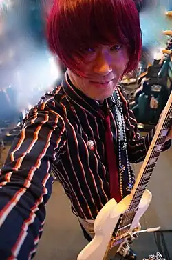 Gibson SG and the mop-top haircut dyed red are his trademarks.