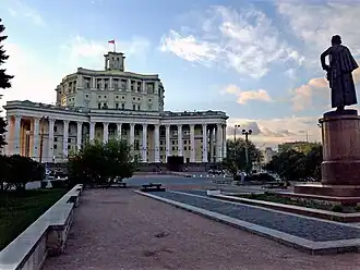 Until the 15th century, the Naprudnaya River bed was located on the site of the square. The development of the territory along the Naprudnaya stream began in the 16th century. Until 1917, the area was called Ekaterininskaya, where the Moscow School of the Order of St Catherine was located from 1802 to 1918. In the 1920s and 30s, the square was radically transformed. The Naprudnaya River was enclosed in a pipe all over, and a square appeared in the center of the square. The Church of St. John the Warrior was demolished in 1947, which was replaced by the predecessor of the now Slavyanka Hotel. Between 1935 and 1940, the Red Army Theater was built in the northern part of the square. In 1928, the building of the Catherine Institute was rebuilt and to house the Central House of the Red Army, where a bust of Mikhail Frunze was erected in front of the building. It was the renamed Commune Square in 1932 under the Soviet authorities in the RSFSR. In 1982, a monument to Russian military leader and national hero Alexander Suvorov was erected in the center of the square.[1] In 1994, it was renamed once again to honor Suvorov.[2]