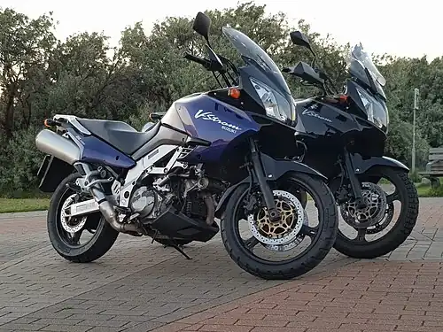 The Suzuki V-Strom 1000, also known as the DL1000, is a Japanese Sports touring or Adventure touring motorcycle, with a 996 cc V-twin engine and a standard riding posture. It has been manufactured in Japan by Suzuki since 2002,[3] although sales in Europe ended in 2009.[5] The name V-Strom combines "V" referring to the bike's engine configuration with the German Strom, meaning stream or power.