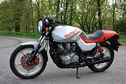 The GSX1000SZ (circa 1981) was a 998cc variant of the GSX1100SZ produced in sufficient numbers to homologate the bike as a production machine that was eligible for racing modification under the then-current international superbike racing rules (which included a 1000 cc displacement limit). The GSX1000SZ had frame serial numbers beginning with GS10X-500001~,[8] and were fitted by the factory with a performance inlet camshaft (part 12711–49201) paired with the same exhaust camshaft as the standard GSX1100SZ (part 12700–45820).[8][9] The 1000SZ also sported round-slide, oval bore Mikuni VM32SS carburetors and was often fitted with optional wire wheels, which were lighter and—with an 18" rear—allowed tire choices more suitable for the track.