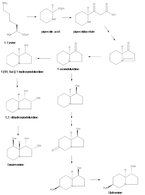 The biosynthesis of swainsonine has been investigated in the fungus Rhizoctonia leguminicola, and it initially involves the conversion of lysine into pipecolic acid. The pyrrolidine ring is then formed via retention of the carbon atom of the pipecolate's carboxyl group, as well as the coupling of two more carbon atoms from either acetate or malonate to form a pipecolylacetate. The retention of the carboxyl carbon is striking, since it is normally lost in the biosynthesis of most other alkaloids.[13]