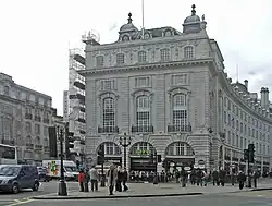 The premises were rebuilt and integrated in 1910–20 to a design by Sir Reginald Blomfield with the interior designed by Murray Adams-Acton. It became a popular place of assignation for Londoners for many generations: under the clock outside the department store, or sometimes the restaurant on the first floor, were often cited as meeting places.[6][7][8] The store sold very high quality goods[9] including the popular Merrythought teddy bear. The shop-front was one of the West End businesses targeted by the Suffragettes in their window-breaking spree on 21 November 1911. The store was hit in the last Zeppelin raid on London on 19 October 1917[10] and again rebuilt and remodelled in 1919, by Louis David Blanc and John James Joass.[11]