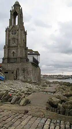 These include the big clock tower near Peveril Point. The clock tower, commemorating the Duke of Wellington, designed by Arthur Ashpitel, was built in 1854 at the southern approach to the old London Bridge. Within 10 years it became an obstruction to traffic on the busy bridge and had to be removed. It was re-erected 1867–68 on its present site at the southern end of the bay on the sea front. A further item transported from London to Swanage is the 1860 façade of the Mercers' Hall, that was used as the façade of the Swanage Town Hall, which was designed by G. R. Crickmay (1830–1907) of Weymouth, and built during the early 1880s.[17] Immediately behind the town hall, but pre-dating it, is the Swanage lock-up. Dating from 1803, it is a scheduled monument.[18]