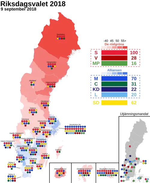 The election resulted in a hung parliament, with the red-green and centre-right coalitions each holding about 40% of the seats, and the Sweden Democrats holding the remainder.[68][69][76]