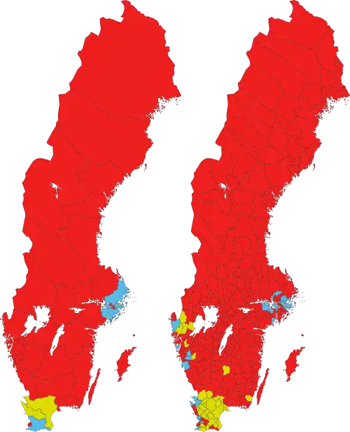 With the government being down to 116 seats (59 short of a majority), this rendered it the government with the lowest electoral support to begin a term during universal suffrage in Sweden and forced to approve several liberal policy platforms the government had campaigned against.[16] With the right-wing opposition having 154 seats, to the coalition and confidence and supply agreements' 167 and the Left Party's 28, it still rendered a hung parliament even after the government formation, which exposed the government to high-profile losses in parliament.[17] With the Liberals leaving the confidence and supply after a no-confidence vote in 2021, the de facto parliamentary blocs ended being 175 to 174 with the de facto majority for the red-greens being 0.1%. The metropolitan versus small town divide got stronger. With the 2021 constellations, the election saw Södermanland and Västmanland retroactively flip to the right for the first time during universal suffrage dating back a century, while also Blekinge went blue for the first time in the unicameral era.[7] Meanwhile, the six largest municipalities had leftist majorities.[7]