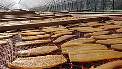 In the Southeastern U.S., sweet potatoes are traditionally cured to improve storage, flavor, and nutrition, and to allow wounds on the periderm of the harvested root to heal.[74] Proper curing requires drying the freshly dug roots on the ground for two to three hours, then storage at 29–32 °C (85–90 °F) with 90 to 95% relative humidity from five to fourteen days. Cured sweet potatoes can keep for thirteen months when stored at 13–15 °C (55–59 °F) with >90% relative humidity. Colder temperatures injure the roots.[75][76]