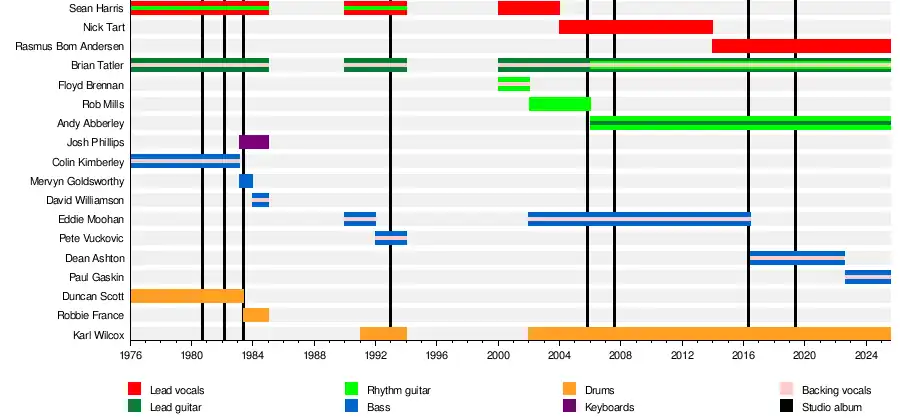 - Brian Tatler – lead guitar, backing vocals (1976–1985, 1991–1994, 2000–present), rhythm guitar (2006–present)