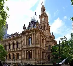 The Town Hall was built from local Sydney sandstone in the grand Victorian Second Empire style,[1] inspired by the French Second Empire Hôtel de Ville in Paris.[3] The Town Hall has been described as having "lavishly ornamented composition with focal tower and fanciful roofs".[10] The building consists of the original Town Hall, mayoral suites and town clerk's offices. These were designed by J. H. Wilson in 1866, having won a civic competition to design a town hall for the rapidly-growing city. Construction of his initial designs were completed under the architectural direction of Albert Bond in 1869.[11] Wilson also designed the interior of the original Town Hall meeting room. The clock tower was completed in 1873[11] to the design of E. and T. Bradbridge and whose clock was installed in 1884. The Centennial Hall and associated offices and entrances were designed by Thomas H. Sapsford in 1883,[11] but after his death were completed by architects David McBeath, John Hennessy and George McRae in 1889.[1]