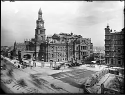 The foundation stone was laid in January 1868 by Prince Alfred, the Duke of Edinburgh.[6] Construction commenced in 1869, and it was designed to be a symbol of the wealth and status of the city. The building was constructed in two stages, Stage I: 1868 - 1878 and Stage II: the Main Hall, 1885 - 1890. The Town Hall design was the result of a competition, won by J. H. Willson. The Second Empire style design (including four eastern pavilions, clock tower, vestibule, reception room and Council Chamber) was modified by the City Engineer to reduce the cost. Following Willson's death Stage I was completed by successive City Architects. The design and construction were associated with intense political and personal battles. In 1875 council occupied the incomplete building in temporary offices on the lower floor. Discussion continued about Stage II, including a report by McBeath in 1878 with costs for the foundations. These proceeded in 1880 but were faulty and work halted.[2]