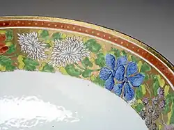 Whilst the Cantonese ceramic painters would have worked from images of Sydney Cove and the Aboriginal group provided by the customer commissioning the punchbowls, the border and edge trims were generally left to the choice of the ceramic painters.[24] The traditional floral motif of such Chinese flowers as chrysanthemums, peonies, cherry and plum blossom has been applied to the internal borders of both bowls in a similar pattern. However, the external borders differ considerably. The Library bowl has a more traditional Chinese outer border design in vermilion, rose and gilt,[62] whilst the Museum bowl has a trim of looped circles on a cobalt blue ground, edged with narrow gold bands.[50] There are other differences. The Library bowl has large, gilded monogram initials on the outside and the footring has a single narrow gold band and gilded lower edge.[62] However, the Museum bowl has no visible monogram but the footring does have "View of the Town of Sydney in New South Wales" lettered in black.[50]