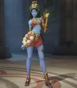 Like other Overwatch characters, Symmetra received skins, unlockable cosmetic items to change her in-game appearance. When developing them, they wanted to reference her scientific background, but also her role as a skilled architect at a major organization. Of particular note, the "Vishktar" skin presents her in a blue-and-white lab uniform with her hair tied into a bun and her visor front replaced with orange lenses. Her "Oasis" skin, on the other hand, was meant to represent the visual themes of the in-game city of Oasis, a scientific community located in Iraq. The "Devi" skin referenced her cultural background by referencing the Hindu god of the same name, giving her blue skin and an outfit that incorporated elements of another Hindu deity, Kali.[10] This particular outfit drew backlash from Rajan Zed, a leader in the Hindu community, who felt it trivialized their religion by "letting players control her movements", and further claimed it was "creating confusion in the minds of [the] community about Devi by misrepresentation." Blizzard Entertainment did not provide a response to Zed's statements.[11]