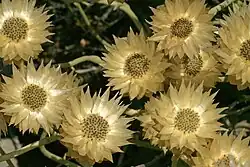Disc-shaped flower heads are borne on the ends of long stems between July and January. They have a diameter of 3–4 cm (1.2–1.6 in).[5] The center starts off yellow, turning brown with age.[3] The flower is surrounded by sharply pointed petal-like bracts.[4] They have a papery texture and are white or cream in colour.[5]