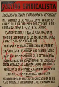 The Syndicalist Party (Spanish: Partido Sindicalista; Catalan: Partit Sindicalista) was a left-wing political party in Spain, formed by Ángel Pestaña in 1932. Pestaña, a leading member of the Confederación Nacional del Trabajo (CNT) trade union, formed the party in response to the growing influence of the Iberian Anarchist Federation over the CNT. He and other notable members of the CNT had previously signed a Manifest dels Trenta ("Manifesto of the Thirty"), which had got them expelled.[2]