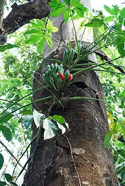 Syngonium /sɪŋˈɡoʊniəm/[3] is a genus of flowering plants in the family Araceae, native to tropical rainforests in southern Mexico, the West Indies, Central and South America.[2] They are woody vines growing to heights of 10–20 m or more in trees. They have leaves that change shape according to the plant's stage of growth, and adult leaf forms are often much more lobed than the juvenile forms usually seen on small house plants. The scientific name of the genus comes from the Greek words σύν (syn - plus, z) and γονή (gone - gonada) and refers to the fused ovaries of female flowers.