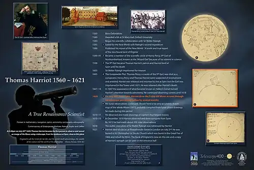 In 1609, Thomas Harriot was working at Syon when he made the first ever use of the newly invented telescope to make astronomical drawings of the moon on 26 June, several months ahead of Galileo's observations.[7] A plaque marking Harriot can be found in the grounds, not far from where the observations took place.