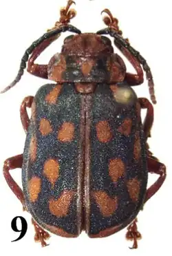 - ^ Part of this text is from โNew World genera of Galerucinae Latreille, 1802 (tribes Galerucini Latreille, 1802, Metacyclini Chapuis, 1875, and Luperini Gistel, 1848): an annotated list and identification key (Coleoptera: Chrysomelidae)โ by Keezhpattillam Viswajyothi, Shwan M. Clark. This article is licensed under the [https://creativecommons.org/licenses/by/4.0/ CC BY 4.0 license