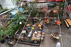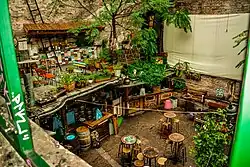 Szimpla Kert is a ruin bar or romkocsma, which means "Simple Garden" in Hungarian, located in the Jewish Quarter of the 7th district of Budapest, Hungary.[1] It is considered the pioneer of ruin bars.[2][3] The pub started as a place for people to find a cheap drink in a relaxed environment, but has grown to become a tourist attraction and community center. Movie showings, live music performances, an art gallery, the Kazinczy Living Library, the Szimpla Farmers' Market, and the Szimpla Bringa bicycle flea market are just a few of the community activities that are held at the bar.[4]