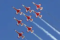 After a 20-year hiatus, the Turkish Air Force decided to establish an acroteam again and started activities to implement the project in 1992. In accordance with the directives of the Commander of the Turkish Air Force, Gen. Halis Burhan, work was started for the establishment of an acroteam in 1992 and approval was received for the establishment of an acroteam within the 132nd Weapon Tactics and Standardized Squadron Command at the Konya 3rd Main Jet Base on 11 September 1992. While the establishment and examination studies were continuing rapidly, the order to establish an acroteam consisting of four NF-5 wings within the 132nd Squadron was issued on 7 November 1992. In the meantime, the selection of the first four pilots who would constitute the core of the acroteam was made. In 1993, double training was started and the planned acrobatic movements were tried and the desired result was achieved after a flight of five sorties. Later, training of right and left wing fliers was started and quadruple training was started. In the meantime, some of the personnel working in the acroteam were sent to England, Canada and Italy to conduct research on the subject. In order to fulfill the acroteam duty with more safety and efficiency, a study was started on April 27, 1993 for the modifications to be made on the NF-5 aircraft, primarily the smoke system and painting of the aircraft, to increase flight safety. While the studies were ongoing, on June 18, 1993, the closing day of the Turkish Air Force Command Shooting Competitions, the Turkish Stars acroteam performed its first official display as a quartet to state dignitaries and other guests at the 4th Main Jet Base Command in Ankara. Following this display the Turkish Stars, which gained fleet status, managed to make a name for itself as the youngest supersonic acrobatic team in the world. In August 1993, the aircraft modification/painting activities were initiated by the 1st Main Jet Base Command and Maintenance Center Command in Eskişehir. During this process, five- and six-wing flight training was also initiated. The modifications and changes made to the 9 NF-5 and 1 NF-5B aircraft allocated to the Turkish Stars acroteam were completed in July 1994 and delivered to the unit.[40]