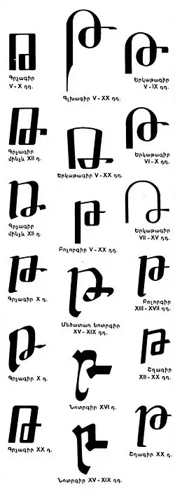 T'o or To (majuscule: Թ; minuscule: թ; Armenian: թո; Classical Armenian: թօ) is the ninth letter of the Armenian alphabet. It has a numerical value of 9.[1] It is created by Mesrop Mashtots in the 5th century AD. It represents the aspirated voiceless alveolar plosive (/tʰ/) on both Eastern and Western Armenian.