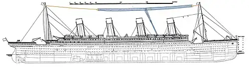 One of the first uses of 'T' aerials in the early 20th century was on ships, since they could be strung between masts. This is the antenna of RMS Titanic, which broadcast the distress call during her sinking in 1912. It was a multiwire 'T' with a 50-metre (160 ft) vertical wire and four 120-metre (400 ft) horizontal wires.