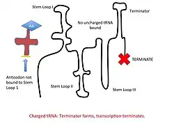 The most common model system used to study T-box leader is in the gram-positive bacterium Bacillus subtilis.[10] In terms of what is currently understood about the regulatory role of T box function, it appears that when the uncharged tRNA is abundant, it binds to the specifier and the T box sequence of an appropriate leader RNA, stabilizing the antiterminator and, in turn, preventing terminator formation.[7] Without terminator formation, transcription will proceed.[7] If, however, the tRNA is charged, its acceptor end will be blocked by an amino acid and thus, cannot pair with the T box.[7] The terminator will then form, thereby terminating transcription.[7]