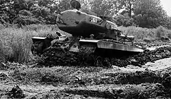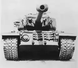 Apart from modifications to fit the different engine, the chassis was the same as the T29.[7] The 155 mm (6.1 in) gun fired separate loading (shell and charge) ammunition. The loader was assisted by a spring rammer.[8] The T30 was fitted with one of the largest guns ever used on an American tank. The high, rounded edge turret was needed to accommodate the standing loader and large gun mount. Even then the gun could only be loaded at limited elevations. It could carry a mixed assortment of 34 T35E1 HVAP (high-velocity armor piercing), M112B1 and T29E1 APCBC-HE (armor-piercing capped ballistic cap high-explosive) M107 HE (high explosive), or M110 WP (Smoke) rounds.[9]