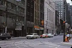 The development of the TD Centre required Fairview to acquire a full city block of downtown Toronto, except for some frontages on Bay Street and at the corner of King and York Streets.[10] Among notable losses from the subsequent demolition were the Rossin House Hotel, which dated to the 1850s and was once one of the city's preeminent hotels. The Carrère and Hastings Bank of Toronto headquarters, at the southwest corner of King and Bay Streets, was also razed despite protests urging that the Beaux-Arts building be incorporated into the new centre. Fairview officials brushed these aside and said that it "did not fit in".[10] Elements of the old edifice can still be found as relics in Guild Park and Gardens, in Scarborough.