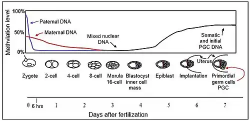 - ^ a b c Messerschmidt DM, Knowles BB, Solter D (April 2014). "DNA methylation dynamics during epigenetic reprogramming in the germline and preimplantation embryos". Genes Dev. 28 (8): 812–28. doi:10.1101/gad.234294.113. PMC 4003274. PMID 24736841.