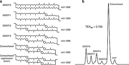 - ^ Wuchter, C.; Schouten, S.; Coolen, M.J.L.; Sinninghe Damsté, J.S. (2004). "Temperature-dependent variation in the distribution of tetraether membrane lipids of marine Crenarchaeota: Implications for TEX86 paleothermometry". Paleoceanography and Paleoclimatology. 19 (4): PA4028. Bibcode:2004PalOc..19.4028W. doi:10.1029/2004PA001041.