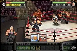 During matches, wrestlers took turns attacking. Moves were selected via a menu and could be used in combos. Powerful special moves were also available and could be executed through quick time events.[4]
