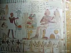 Although not completed, TT56 is, architecturally, one of those inverted "T" tombs typical of the New Kingdom,[9] with a front courtyard that serves as a hallway to reach other tombs (TT123, TT294, TT293, TT292, TT291); it is one of the tombs whose wall paintings are best preserved among those of the necropolis of Sheikh Abd el-Qurna. A short access corridor (1 on the plan) in which the deceased and his wife are depicted adoring Osiris, is followed by a transversal room; on the walls: (2) the deceased followed by his wife and mother with bunches of flowers; (3) on five superimposed registers, the inspection of the livestock, the slaughter of some bulls, the harvest and the transport of wheat while some women proceed to collect the flax in the presence of the deceased. A little further on, on the short side (4), in a double scene, the deceased offers bunches of flowers to Iamunedjeh (TT84), the king's first herald and of whom he was the deputy, and to his wife, on the left, and to another couple (whose names are not specified), on the right. Below, on the same wall, a stele with priests purifying the statue of the deceased and a reading priest [N 14] who performs the Opening of the mouth ceremony on the deceased.[10]