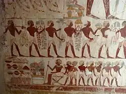 A short corridor, in which the deceased appears in the presence of Osiris and Anubis, allows access to a room in which (13-14-15) escort soldiers are represented while the deceased is hunting, in the desert, on board a chariot, various animals including some hyenas. Scenes of fowling and fishing practiced by the deceased and his wife Mutnofret as well as offerings to the deceased of animals and products from the marshy lands of the Nile Delta. A funerary procession develops along a wall (16-17-18), with a priest who performs the ceremony of the opening of the mouth; the room has at the back (19) a niche that houses the statues of the deceased and his wife.[11]