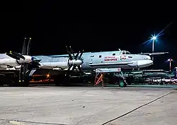 Designed as a stopgap in case the Tu-114A was not finished on time, two Tu-95 bombers were fitted with passenger compartments. Both aircraft had the same layout: office space, a passenger cabin consisting of two sections which could each accommodate 20 people in VIP seating, and the rest of the 70 m3 (2,500 cu ft) cabin configured as a normal airliner. Both aircraft were eventually used as crew ferries by the various Tu-95 squadrons.[11] One of these machines is preserved at Ulyanovsk Central Airport.