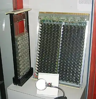 The choice of the main type of memory used in the TXE2 (and the TXE4) was particularly characteristic of the general design philosophy, that the components used had to be of a technology that had been tested over many years. The choice thus went to the Dimond ring type of memory, named after T. L. Dimond of Bell Laboratories, who invented in 1945.[2] They were large-diameter magnetic ferrite toroidal rings with solenoid windings, through which are threaded writing and reading wires. These racks gave the ability to convert a subscriber's directory number into an equipment location identity. This was a considerable innovation in British exchanges since in Strowger exchanges the directory and equipment numbers had to be the same.
