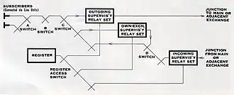 The switching network was composed of reed relay cross-points arranged to give three (A, B and C) stages of switching on either side of a number of linking circuits. The A-stage switches concentrate traffic from the peripheral terminals on to B-C-stage arrays, which are internally connected to provide full accessibility between every B-switch terminal and every C-switch terminal of the array. A simple switch enabling two subscribers to be connected to two others can be constructed, but extending this to larger sizes becomes increasingly uneconomic. Nevertheless, by splitting the network into two stages, considerable economy could be affected.