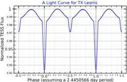 TX Leonis, also known by its Flamsteed designation 49 Leonis, is a triple star system that includes an eclipsing binary, located in the constellation Leo. It was discovered to be a variable star, showing eclipses, by Ernst-Joachim Meyer in 1933.[16] The apparent magnitude of TX Leonis ranges between 5.66 and 5.75, making it faintly visible to the naked eye for an observer located well outside of urban areas.[3] The star's brightness drops by 0.09 and 0.03 magnitudes during the primary and secondary eclipses respectively, and neither the primary nor the secondary eclipse is total.[6]