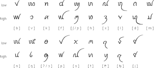 Initial consonant letters have both high and low forms, which are used to indicate tones. The high consonants are used for the syllable final letters -w, -y, -m, -n and -ng. The low consonant letter -k is used for final /k/- and /ʔ/-sounds, while low consonant letters -b and -d are used for final /p/ and /t/.[8][7]