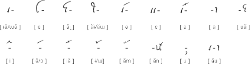 The script consists of 31 consonants and 14 vowels.[3] Unlike most other abugidas or brahmic scripts, the consonants do not have an inherent vowel, and every vowel must be specified with a vowel marker. Vowels are marked with diacritic vowel markers that can appear above, below or to the left and/or right of the consonant.[1] Some vowels carry an inherent final consonant, such as /-aj/, /-am/, /-an/ and /-əw/.[7]