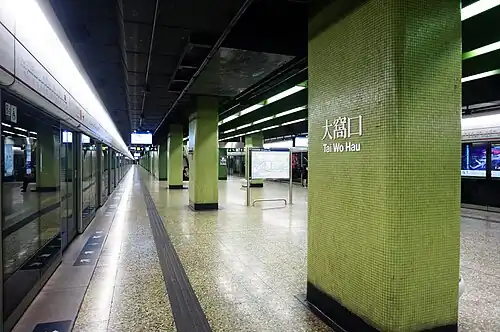 Tai Wo Hau (Chinese: 大窩口; Cantonese Yale: Daaih wō háu) is an MTR station between Tsuen Wan and Kwai Hing stations on the Tsuen Wan line. It serves the areas of Kwai Yin Court and Tai Wo Hau Estate in the Kwai Tsing District, and some resited villages (such as Kwan Mun Hau Tsuen) in the Tsuen Wan District of Hong Kong. These villages were originally in Tsuen Wan town centre, being moved for new town development.