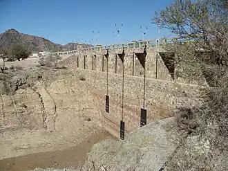 Located 40 km (25 mi) north of Ta'if is the site of the Souk 'Okaz,[69] the largest and best known of the pre-Islamic souks.[70] The souq was a scene of annual social, political and commercial gatherings. It was also the location of competitive recitation of poetry and prose. The buildings remain, including prominent outlines of walls of basaltic stone. Wadi Mitna is a wadi believed to be the location where Muhammad sought refuge from the tribes of Hawazin and Thaqif in 619 AD, after he was stoned by the tribes. He was later given sanctuary by his fellows in a small house, which has now been converted into a mosque. Shubra Palace is the regional museum of Ta'if, housed in a building built around 1900, which served as Ibn Saud's lodging in the 1930s,[71][72][73] and was also used as the Presidency of the Council of Ministers of Saudi Arabia during King Faisal's reign.[8] The Turkish Fort was a fort located near the Souk 'Okaz, many battles have been fought here and many prominent graves can be found, though only a small part of the original fort remains. Legend has it that Lawrence of Arabia also fought here.[41][42][43] The Badawi Fortress is located in the southern reaches of East Ta'if.