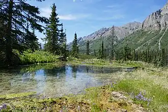 The northernmost area is an arctic tundra which is beyond the tree line, so is characterised by small plants and shrubs.[1][3] These transition to alpine tundra and lowland taiga in a southeastern arc across the zone. To the northwest are rolling hills, throughout which are found broad wetlands reaching the coast of the Beaufort Sea. The interior, comprising the Selwyn Mountains and Mackenzie Mountains, is primarily steep, mountainous terrain with sharp, narrow valleys.[1]