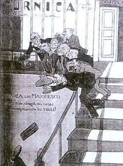 He sided with the Conservative Nicolae Filipescu, who shared his views on the issue of Transylvania, and provoked a conflict within his grouping at a time when the PNL was strengthening itself by incorporating a large part of the Romanian Social Democratic Workers' Party.[6] Around 1907, seeking party leadership, he came to oppose the other main Conservative leaders Cantacuzino and Petre P. Carp[17][18][19][20] — the latter represented the party's Junimea faction, which had just re-entered the main Conservative Party after an independent existence under the name of Constitutional Party; Ionescu also repeatedly clashed with the other Constitutional leader, the influential literary critic Titu Maiorescu.[21] Constantin Xeni, his future collaborator, argued that "the boyar wing of [the Conservative Party] had made life impossible for this son of an obscure bourgeois from Ploieşti".[2]