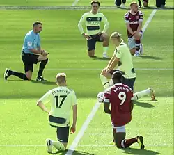 Taking the knee (or taking a knee) is a symbolic gesture against racism whereby an individual kneels upon one knee in place of standing to attention for an anthem or other such occasion. It was originated by American football player Colin Kaepernick on September 1, 2016, in protest against the lack of attention given to the issues of racial inequality and police brutality in the United States. Kaepernick's protest led to a wider series of national anthem protests.[1] It has since been adopted by sports players in countries around the world, including association football in the United Kingdom, in solidarity with Kaepernick's protest against racism, and has been seen worldwide in non-sporting contexts such as the Black Lives Matter protests.[1][2]