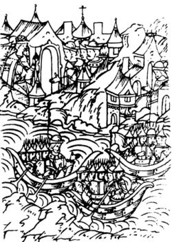 The following year, the Russians set out from Kotelnich in the Vyatka Land. They sailed down the Vyatka River and the Kama towards the Volga, pillaging merchant vessels on their way. In response, Ibrahim mounted a counter-offensive, overran Vyatka, and forced local inhabitants into slavery for the duration of the campaign.[15]