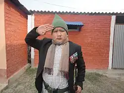 Takme Buda (Nepali: तक्मे बुढा; alternative spelling: Takme Budha) is a fictional character on the NTV-produced television series Meri Bassai. He is portrayed by comedian actor Wilson Bikram Rai.[1] He is an old Gurkha war veteran Limbu man who has fought World War I and often tells his story to other people about how he survived in the war. He belongs to Rai and Limbu both community because his father is Rai and Mother was Limbu. he performs as a veteran Limbu soldier imitating the Limbu ascent to entertain spectators in Meri Bassai,a television program. His tone tallies with Limbu mother language speaking people in the television show .[2]