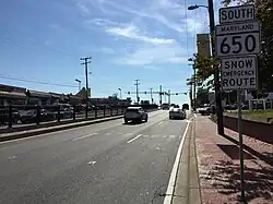 Takoma Park sits on the edge of the Mid-Atlantic fall line and is thus quite hilly, with many narrow, gridded streets. According to the United States Census Bureau, the city has a total area of 2.09 square miles (5.41 km2), of which, 2.08 square miles (5.39 km2) is land and 0.01 square miles (0.03 km2) is water.[41] Sligo Creek and Long Branch (both tributaries of the Northwest Branch of the Anacostia River) flow through the area. Sligo Creek Park and the 9-mile (14 km) Sligo Creek Trail bisect the area. The main street, Carroll Avenue, and the main state highway, Route 410/East West Highway, narrow to two lanes within city limits. Takoma Park has an extensive hardwood tree canopy which is protected by local ordinance.