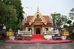 An alternative account (by the Official Vietnamese Chronicles) states that Taksin was ordered to be executed in the traditional Siamese way by General Chao Phraya Chakri at Wat Chaeng: by being sealed in a velvet sack and beaten to death with a scented sandalwood club.[76] Another account claimed that Taksin was secretly sent to a palace located in the remote mountains of Nakhon Si Thammarat, where he lived until 1825, and that a substitute was beaten to death in his place.[77] King Taksin's ashes and those of his wife are located at Wat Intharam Worawihan, Thonburi. They have been placed in two lotus bud shaped stupas which stand before the old hall.[78]