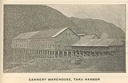 The San Juan Fishing & Packing Company started salmon processing in the late 1800s in Taku Harbor at a prominence on the northwestern aspect of the harbor. In 1901, the operation was sold to Pacific Cold Storage Company who established the first cold-storage plant in Alaska at the site.[7] The facility was subsequent leased and then sold to John L. Carlson Company. In 1918, the cannery was sold to Libby, McNeil, and Libby who then ran and expanded the facility through large fires in 1919 and 1931. The cannery and cold storage was final closed and partially dissembled in 1947.[8]