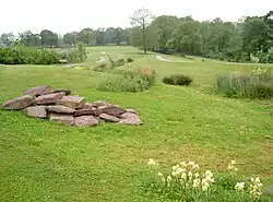 The second version says that the Grès Saint-Méen was a kind of menhir upside down that had traces of acorn cups on the top. During the 6th century, after sharpening his battle axe on this stone, Saint-Méen said "Where this battle axe will fall is where Méen will build". Then he built the church of Talensac, 1.200m further long, where the battle axe felt. According to the same version, the stone was used as an altar for the immolation of human victims. Saint-Méen might have been attacked by one of his former followers. He managed to avoid the knocks of his disloyal apostle. But this last, while trying to kill Saint-Méen, hit the stone which felt right on him. We say that his body is still underneath.