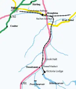 Starting from Caledonian Railway metals at Rachan Junction, near Broughton station (originally part of the Symington, Biggar and Broughton Railway), the railway followed the route of the River Tweed and what is now the A701 closely for 8 miles (13 km) in a southerly direction. It extended to Victoria Lodge, the headquarters for the dam's construction. An intermediate stop with wooden platforms was later established at Crook Halt, to serve the Crook Inn.